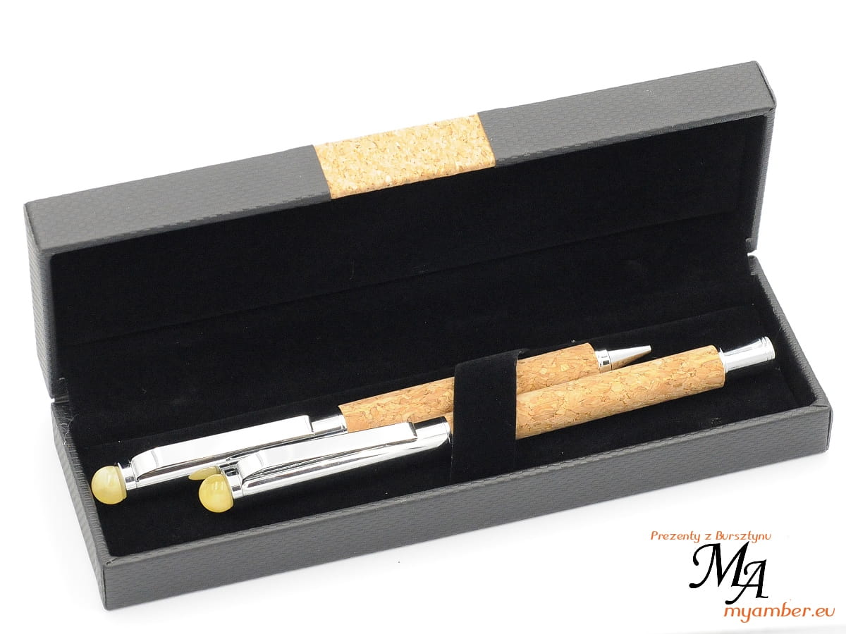 Zestaw z Bursztynem długopis i pióro korek ECO na prezent Upominek Bursztyn + Certyfikat